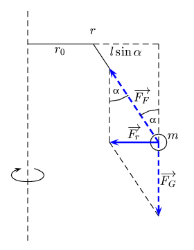 Auf die am Faden hängende Masse m wirken zwei Kräfte, nämlich die Gewichtskraft (nach unten gerichtet) und die vom Faden ausgeübte Zwangskraft (schräg nach oben). Die Gesamtkraft dieser beiden Kräfte (Vektoraddition!) ist die nach innen zur Drehachse gerichtete Zentripetalkraft.