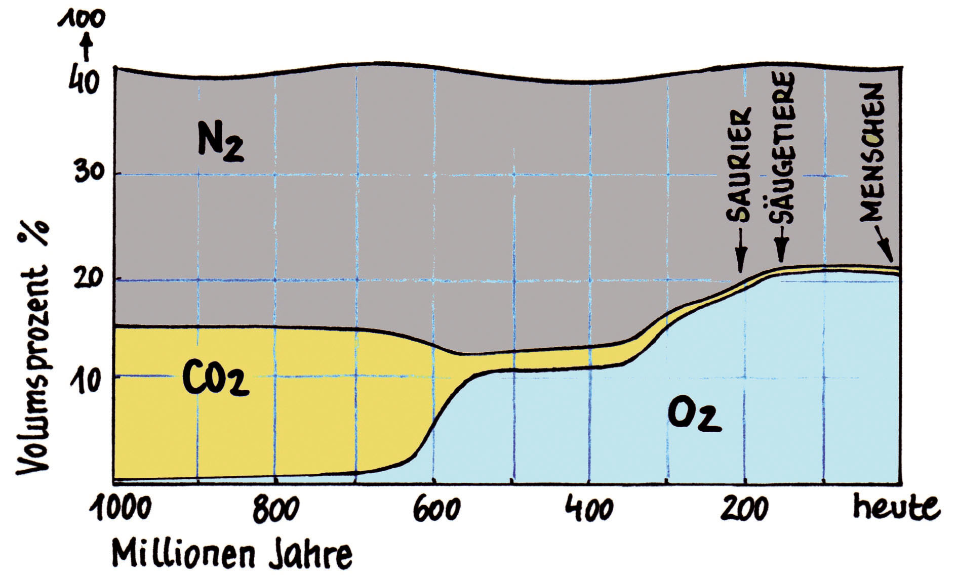 Schematische Darstellung der Entwicklung der Uratmosphäre bis heute